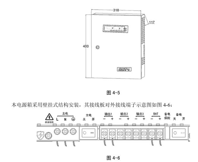 本電源箱采用壁掛式結(jié)構(gòu)安裝,其接線板對外接線端子示意圖如圖 4-6: