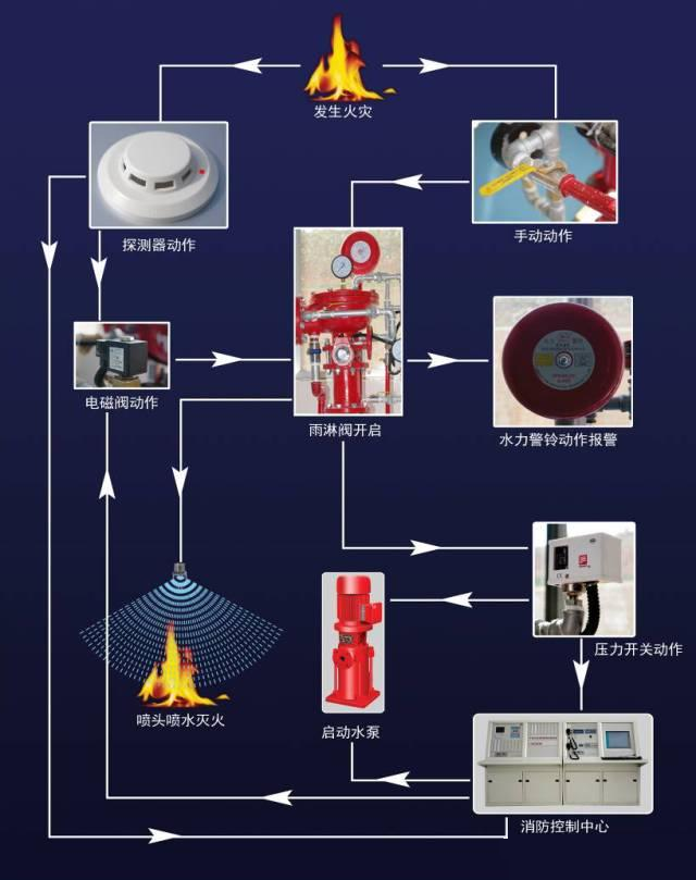 保護區域出現火警時,探測系統首發動作,打開預作用雨淋閥以及系統中用于排氣的電磁閥(出口接排氣閥),此時系統開始充水并排氣,從而轉變為濕式系統,如果水勢繼續發展,閉式噴頭開啟噴水,進行滅火。這樣就克服了雨淋系統會因探測系統誤動作而導致誤噴的缺陷。