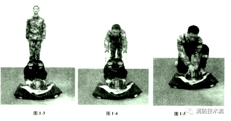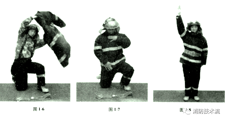 服裝擺放方法:插環式安全帶(附安全扣)折成雙疊,橫放在地面上;滅火防護服上裝正疊,尼龍搭扣對齊展平,沿兩側向背后折起,攔腰折成兩疊,衣領翻向兩側,衣袖縮入肩部成圓筒狀,平放在安全帶上,消防頭盔平放,帽徽朝前,帽釘朝上;下裝套在消防員滅火防護靴上,放于上裝后面,靴跟與器材線對齊。